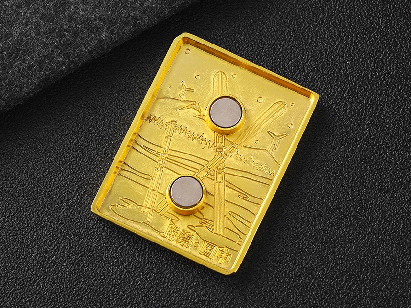 【制作工艺】:冲压 【上色工艺】:烤漆 【电镀颜色】:金色 【背面工艺】:金属凹凸 【产品配件】:磁铁扣
